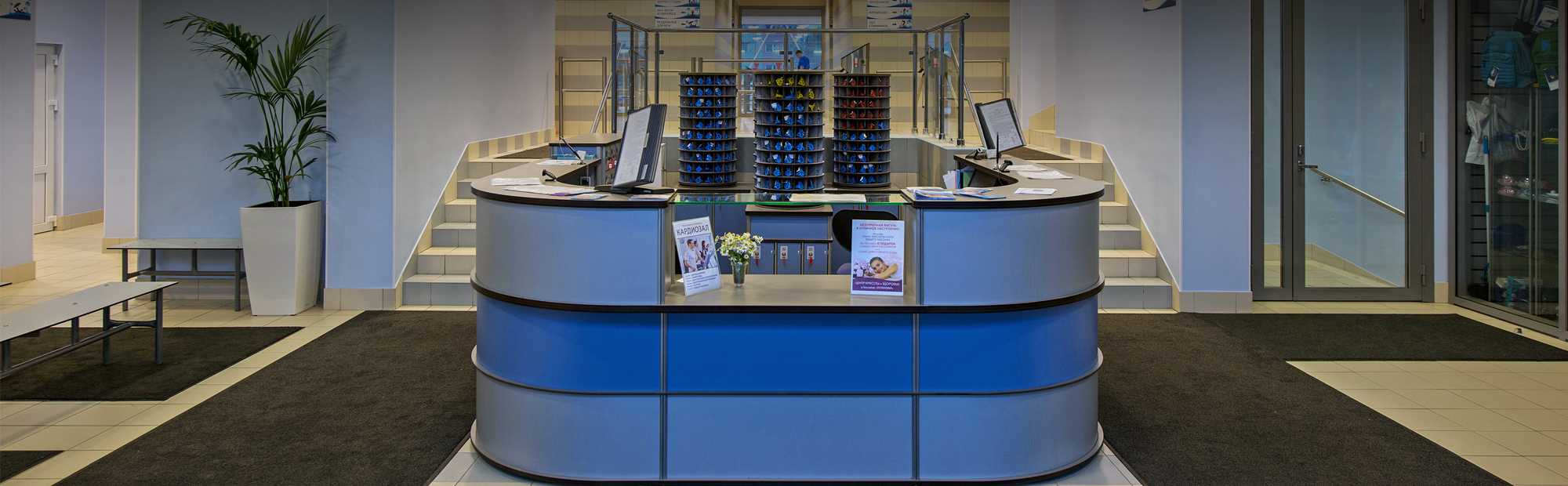 стойкой-ресепшн с ячейками для хранения клубных карт и ключей, пристенной тумбой с раздвижными дверями, секциями вешалок для верхней одежды, тумбами для сменной обуви и скамьями. В едином стиле оформлена и мебель для кафе плавательного бассейна: барная стойка и пристенные тумбы. - В тренажерном зале комплекса широко представлены силовые тренажеры и свободные веса FOREMAN.