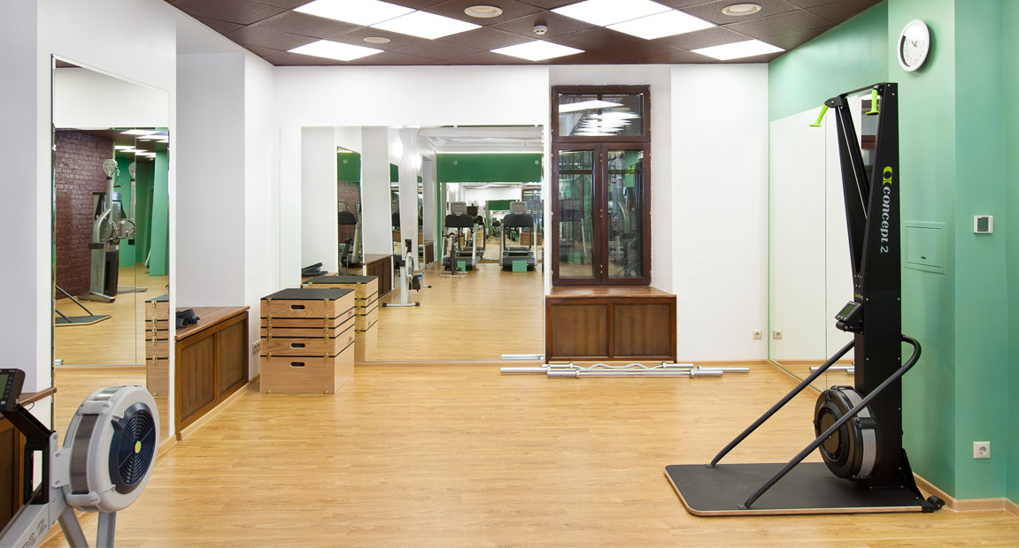 Пространство разделено на парадную часть с зоной рецепции и уютной гостиной с диванами и обеденным столом и тренировочную зону с «верхним» и «нижним» залами, названными так по расположению относительно переулка.