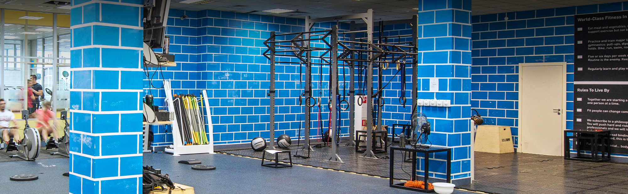 Большое помещение для занятий КроссФит со всем необходимым оборудованием: гребные тренажеры Concept, рамы для функционального тренинга FOREMAN, оборудование и аксессуары PERFORM BETTER.