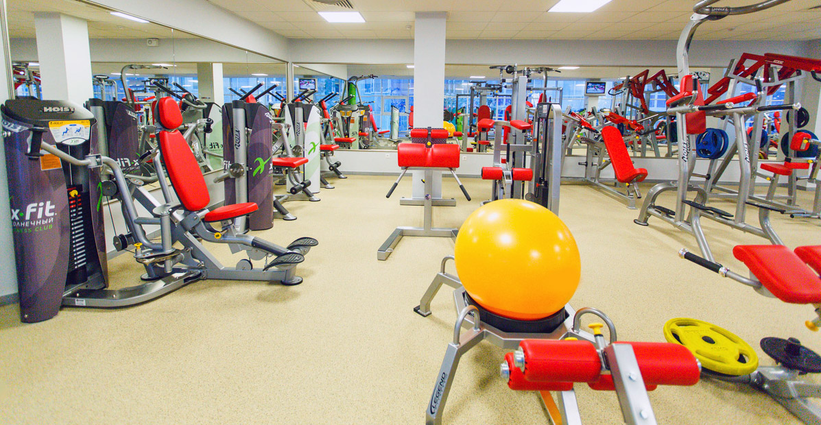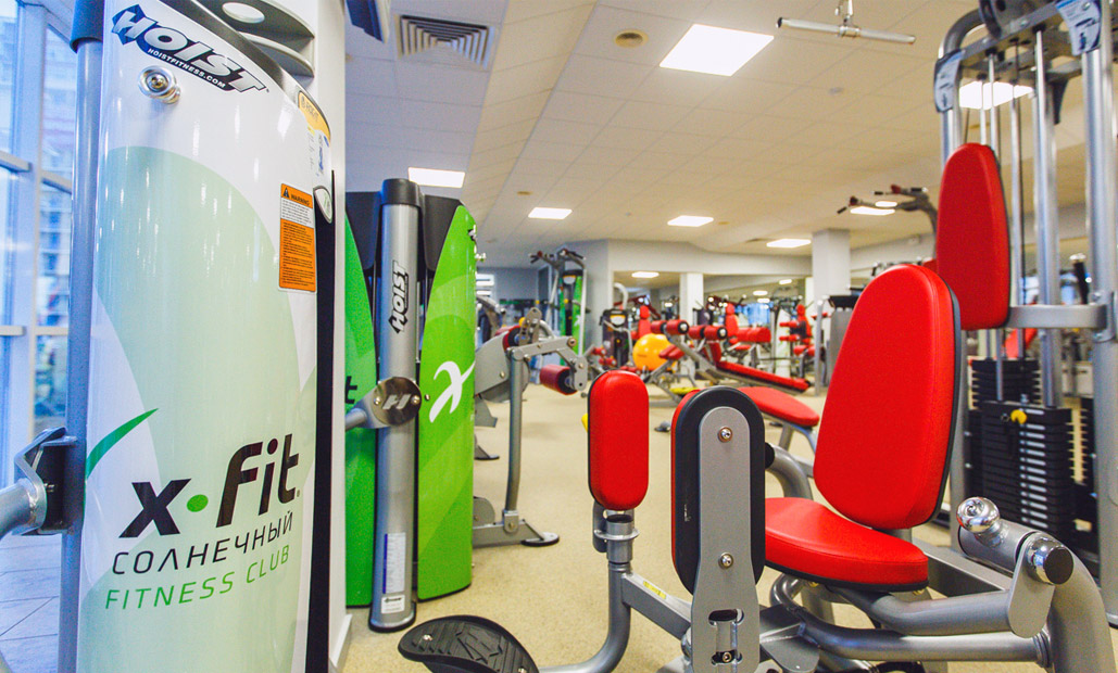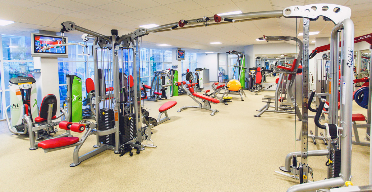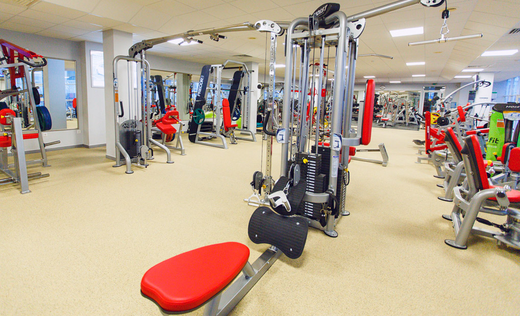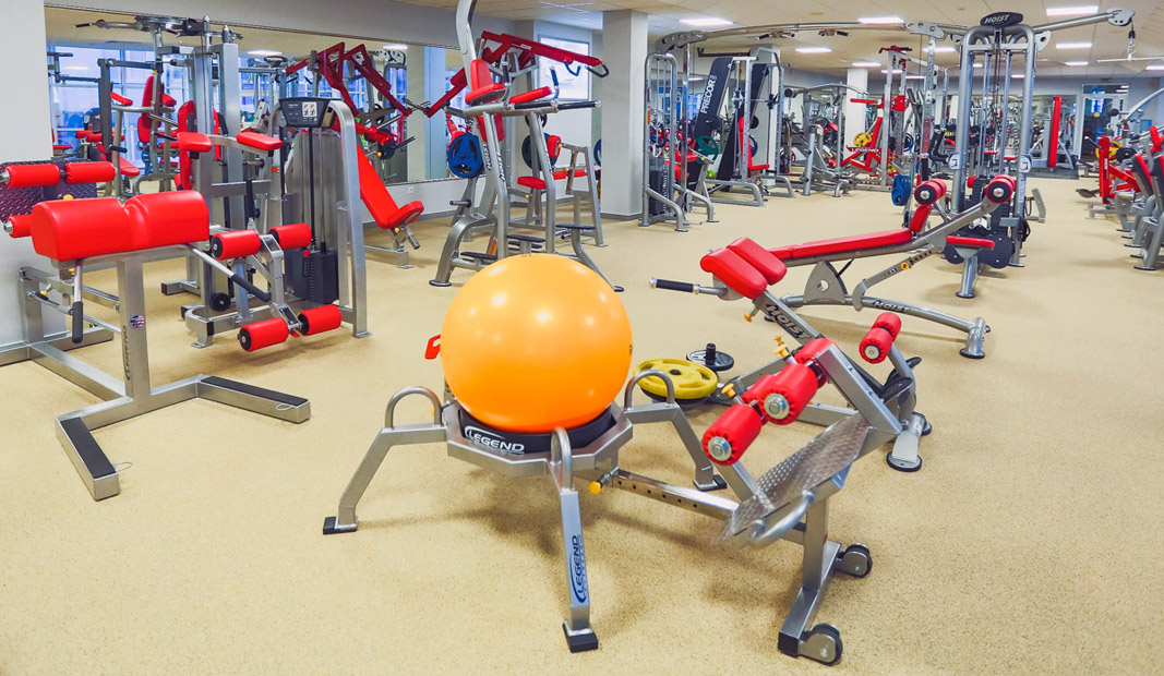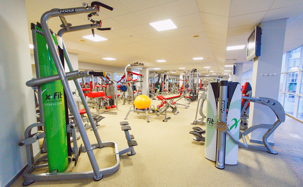 Просторный тренажерный зал оснащен тренажерами Legend Fitness и Hoist c нестандартным оформлением зачехления весового стека в соответствии с фирменными цветами клуба.